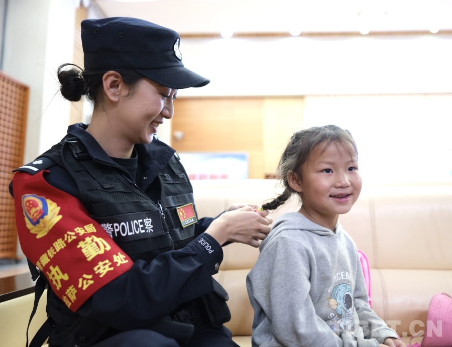 圖為5月31日,馬曉琴在執(zhí)勤時(shí),深受小朋友的喜愛(ài),拉著格?;ㄞp起頭發(fā),想要跟格?;ㄒ粯屿n麗 攝影:賀瑞明
