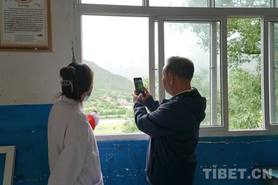 圖為上午義診結(jié)束后,四郎曲珍為魏希發(fā)介紹當(dāng)?shù)氐娘L(fēng)景 攝影:周晴晴