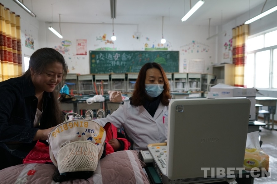 圖為7月9日,首都醫(yī)科大學附屬北京安貞醫(yī)院小兒心臟中心主任醫(yī)師李文秀在阿察小學義診點為兒童做超聲檢查 攝影:周晴晴