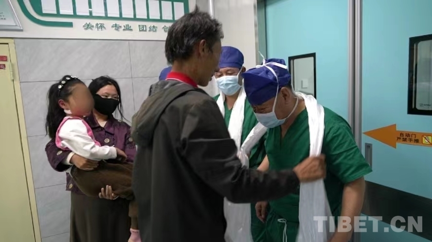圖為7月10日,手術成功后,患兒家長為醫(yī)療專家獻上哈達表達感謝 攝影:周晴晴