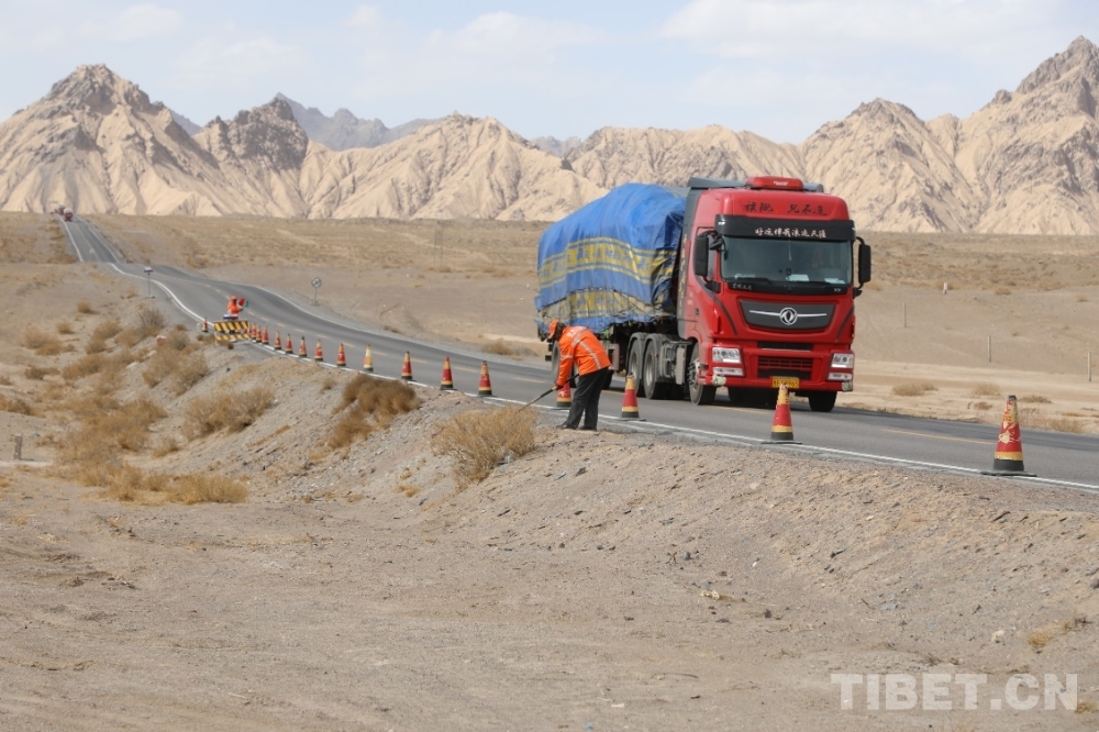 圖為青藏公路上行駛暢通無阻的汽車和勤勞的道班工人 攝影:王茜