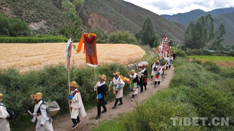 當天清晨,村民們一大早身穿華麗的藏裝,頭戴“次仁金果”、高舉幡旗、身背經(jīng)書、手持青稞麥穗等作物,分成兩隊從村口出發(fā),轉村里的每一塊農(nóng)田進行“收斂地氣、祈求豐收”的巡游活動。浩浩蕩蕩的隊伍傾村而出,大家以不同的口號與詠唱,祈求風調(diào)雨順,國泰民安。