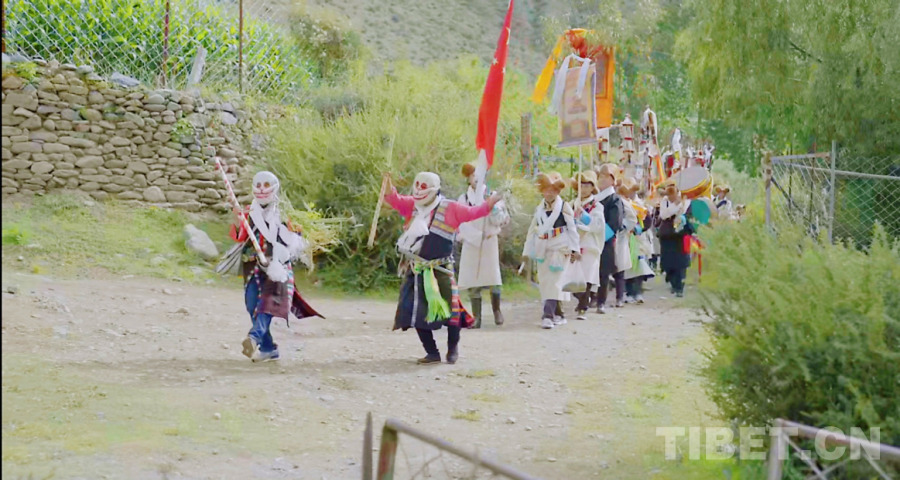 在望果節(jié)這一天,村里會選四位村民扮演成“土鍋杰日”,他們戴著面具,身穿“土鍋杰日”獨有的服飾走進每家每戶表演“羌姆”舞祈求平安順遂、來年豐收。這個特別的儀式蘊含著勞動人民勤勞智慧、團結互助、尊重自然的價值理念。
