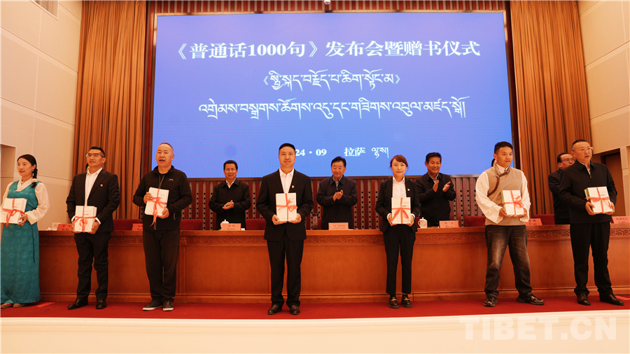 中國(guó)西藏網(wǎng)訊 為進(jìn)一步助力國(guó)家通用語(yǔ)言文字推廣普及,鑄牢中華民族共同體意識(shí)。9月20日,西藏自治區(qū)藏語(yǔ)委辦(編譯局)在拉薩舉行了《普通話1000句》漢藏對(duì)照版新書(shū)發(fā)布會(huì)暨贈(zèng)書(shū)儀式。西藏自治區(qū)政府副主席、自治區(qū)藏語(yǔ)委副主任甲熱·洛桑丹增出席會(huì)議,西藏自治區(qū)藏語(yǔ)委辦(編譯局)黨組副書(shū)記、主任(局長(zhǎng))達(dá)娃次仁作新書(shū)出版介紹,會(huì)上宣讀了教育部語(yǔ)文出版社發(fā)來(lái)的賀信,并向與會(huì)代表贈(zèng)書(shū)。