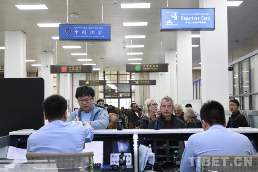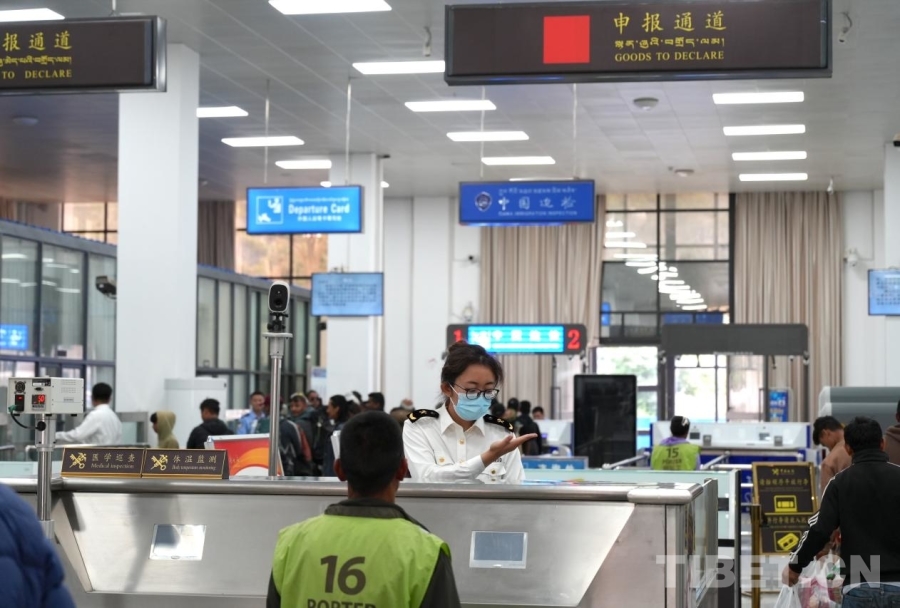 另一邊,在吉隆口岸出境大廳內,吉隆出入境邊防檢查站執(zhí)勤二隊副隊長曹剛正帶領著隊員為過境旅客辦理手續(xù)。關卡設置快捷便利,信息化的通關服務極大地提高了通關效率。來自福建的陳女士便是其中一位受惠者,“很多(尼泊爾的)邊民是因為購物出入境的,他們看我們是中國游客,就讓我們先過檢,通關挺順利的,也很快?!?nbsp;