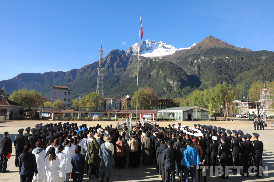 圖為10月1日上午,吉隆縣國門黨建一體化“大黨委”舉辦“七十五載迎盛世 砥礪前行續(xù)華章”主題活動,組織成員單位在吉隆出入境邊防檢查站營區(qū)舉行升國旗儀式 攝影:肖富貴