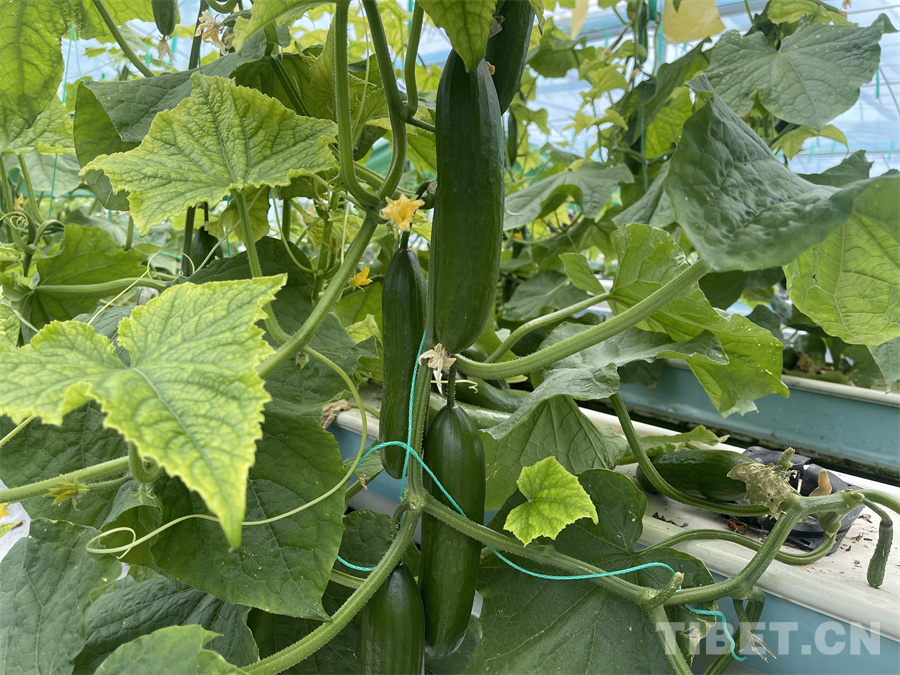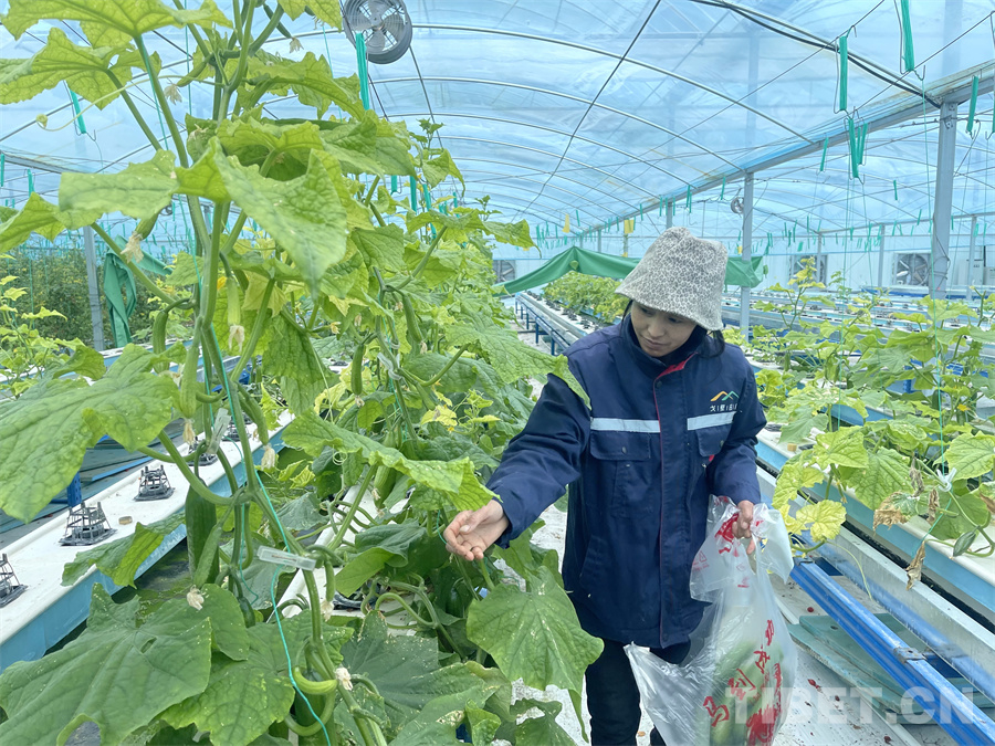 圖為八宿縣白瑪鎮(zhèn)產(chǎn)業(yè)園區(qū)內(nèi),工作人員正在采摘無土栽培出的成熟黃瓜 攝影:王妍丹