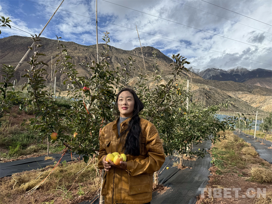 圖為在八宿縣西巴重點(diǎn)經(jīng)濟(jì)林基地工作的嘎桑曲珍正在展示手中的維納斯黃金蘋果 攝影:王妍丹