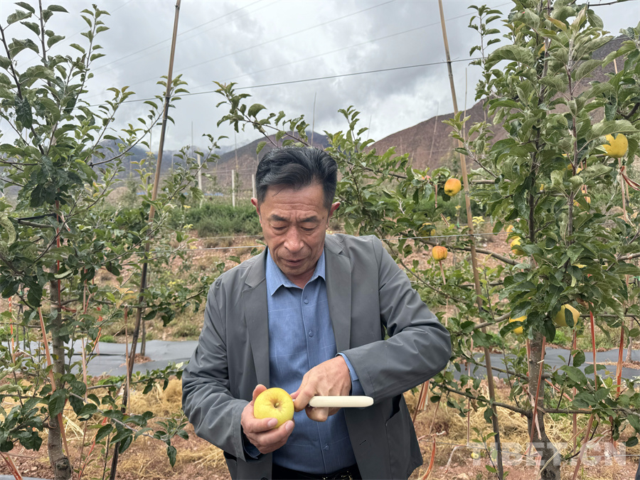 圖為煙臺(tái)大山果業(yè)開發(fā)有限公司高級(jí)農(nóng)藝師曲寶君正在拿機(jī)器測(cè)試維納斯黃金蘋果的糖分 攝影:王妍丹