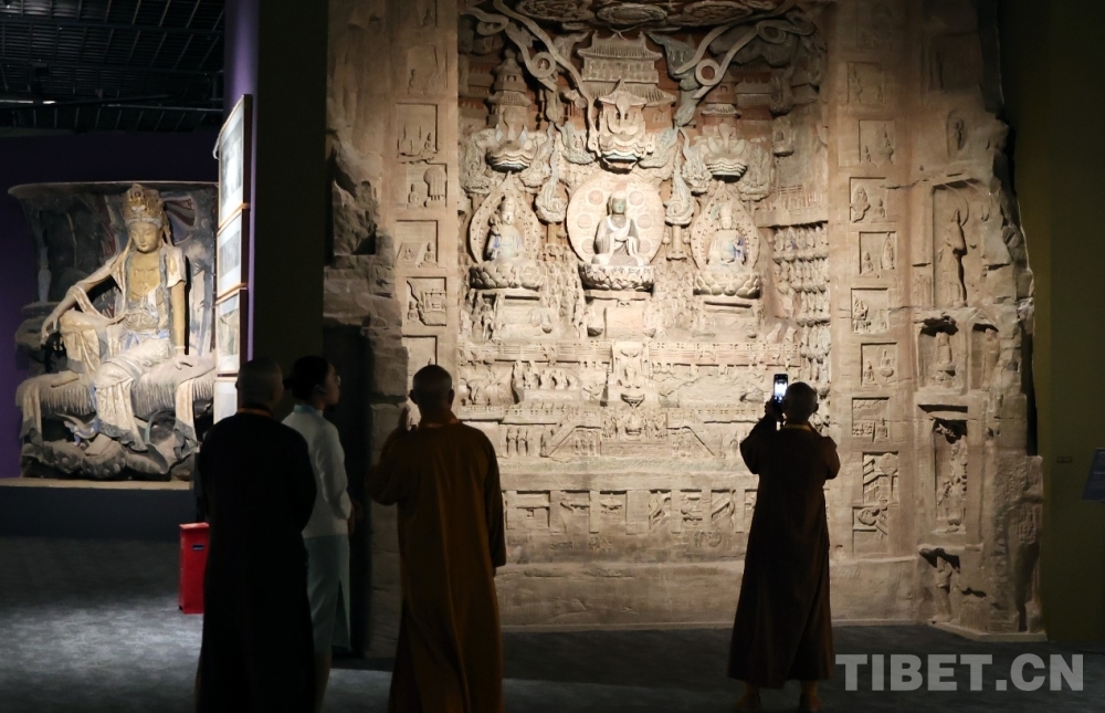 圖為與會者在“翰墨佛緣——‘中國歷代繪畫大系’佛教藝術珍品展”上參觀大足石刻北山佛灣第245龕觀無量壽佛經變相龕(3D打印復制)