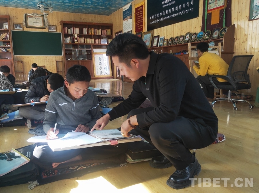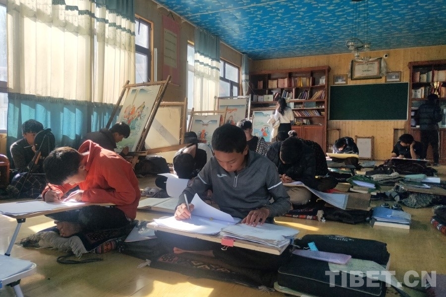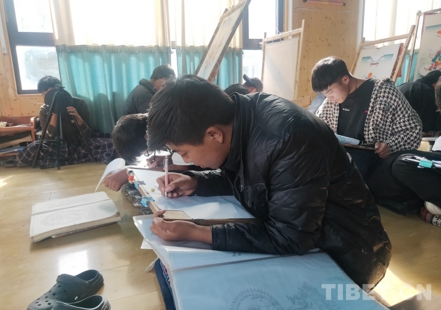 在一家唐卡技藝傳承工坊內(nèi),記者見到了來自青海省玉樹州囊謙縣的更嘎東周。因從小喜愛繪畫,經(jīng)表哥索南拉讓介紹,他慕名來到嘎瑪鄉(xiāng),師從國家級非物質文化遺產(chǎn)藏族唐卡嘎瑪嘎赤畫派市級代表性傳承人嘎瑪斯加學習唐卡繪畫技藝。剛學藝一年的更嘎東周,還在練習唐卡繪畫學習的第一個步驟——白描。學習繪畫總是需要耗費大量時間和精力的,可是他卻甘之如飴,“因為喜歡,所以不覺得辛苦。在這里學習可以包吃包住,老師對我們也很好。我的目標是希望能夠在兩年左右的時間內(nèi),完成白描階段的學習?!薄 ?/p>