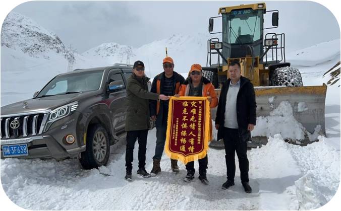 隨著川配項(xiàng)目的進(jìn)駐,我們負(fù)責(zé)管養(yǎng)的S303線,過(guò)往車輛70%為川配項(xiàng)目物資運(yùn)輸車輛。2023年3月1日,中冶交通建設(shè)集團(tuán)有限公司翻越果扎拉山,將一面寫著“災(zāi)難無(wú)情人有情,臨危不懼保暢通”的錦旗送到了我們4名保通員手中。他們說(shuō),每每經(jīng)過(guò)果扎拉山,白茫茫一片公路,其中閃現(xiàn)著橘色的身影,既讓他們心安,又讓他們心疼,更讓他們佩服。來(lái)西藏前,他們只是聽(tīng)說(shuō)過(guò)“兩路”精神、老西藏精神,進(jìn)入施工后,才懂得那橘色的身影就是“兩路”精神的化身。