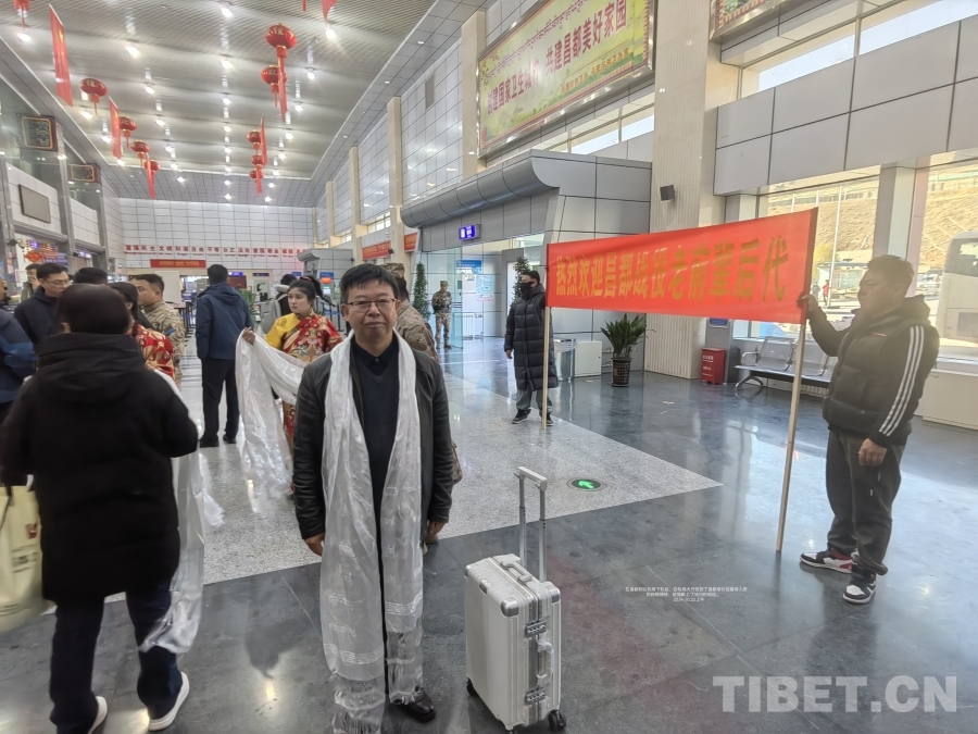 我懷著無(wú)比激動(dòng)的心情走進(jìn)機(jī)場(chǎng)大廳,看見(jiàn)對(duì)面不遠(yuǎn)處昌都軍分區(qū)的工作人員,身后豎立著一條橫幅寫(xiě)著:“熱烈歡迎昌都戰(zhàn)役老前輩后代”,場(chǎng)面熱烈而隆重。