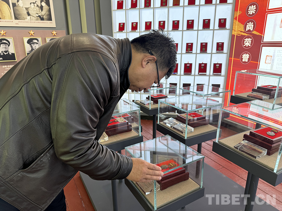 圖為于雁軍在觀看捐贈(zèng)給博物館的、父親于鳳山的軍功章
