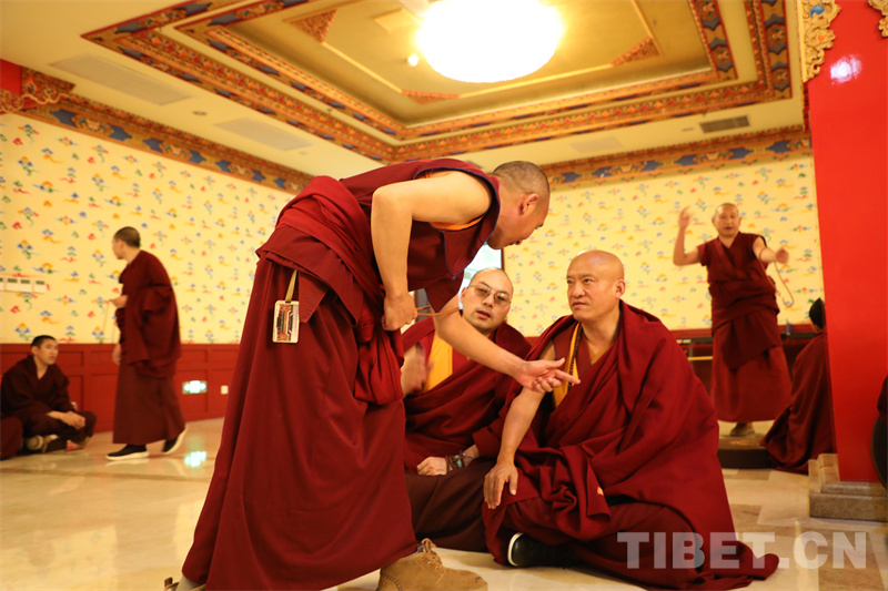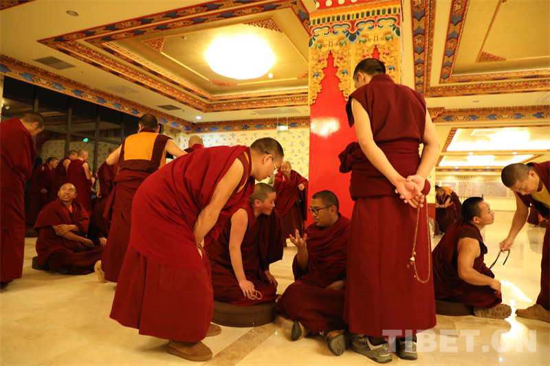 下午,師生們旁聽了中國特色社會主義理論和憲法與法律基礎(chǔ)等課程。晚上,開展了精彩非凡的辯經(jīng)活動。學(xué)員們各自組團尋找“對手”,大廳里激烈的辯論聲、擊掌聲此起彼伏,場面熱烈,氣勢逼人。辯經(jīng)是藏傳佛教中一種獨特的學(xué)習(xí)方式,通過對辯雙方邏輯清晰、言之有據(jù)的反復(fù)辯論,加深學(xué)習(xí)理解。