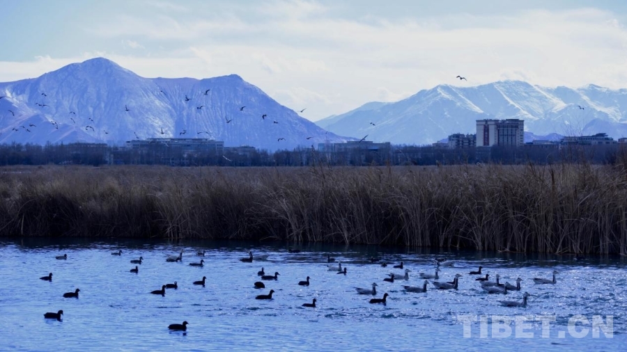 圖為在拉魯濕地湖泊中覓食的鴨群和遠(yuǎn)處雪景形成一幅美麗的畫卷 攝影:德吉卓瑪