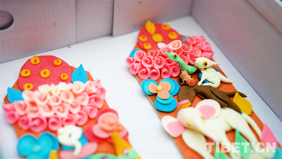 在拉薩市最大的年貨市場八廓商城的東側(cè),售賣酥油花的攤位整齊排列。經(jīng)營者大多是50歲以上的中年人,他們有豐富的手工酥油花制作經(jīng)驗(yàn),主要以家庭作坊的形式制作售賣,幾個(gè)隨手可拎起的鞋盒就是他們的“商鋪”。和氣四瑞、長壽六寶、吉祥八寶,經(jīng)營者們用自己的巧手捏制出不同的圖案,將家庭和睦、健康長壽、吉祥如意的寓意帶給一戶又一戶人家。