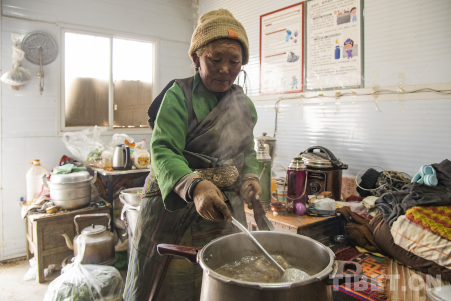 圖為曲珍老人正在安置板房內準備“古突” 攝影:趙振宇