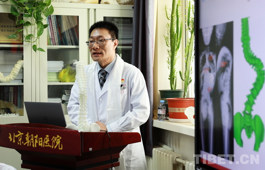 圖為北京朝陽醫(yī)院骨科主任、首都醫(yī)科大學骨外科學系主任、國際腰椎研究學會候任主席海涌介紹該院骨科團隊在救治高海拔地區(qū)脊柱側彎患者方面所做的工作 攝影:劉莉