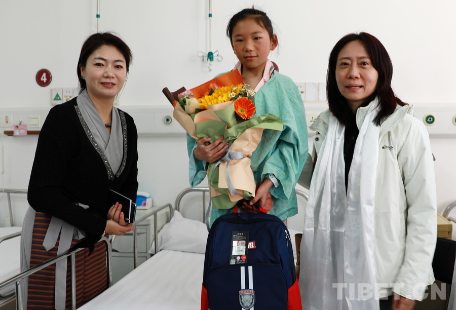 圖為北京啟明星辰慈善公益基金會理事長王?,摚ㄓ乙唬┡c四川省甘孜州石渠縣衛(wèi)健局副局長向巴啟西(左一)向在北京朝陽醫(yī)院接受救治的四川省甘孜州石渠縣脊柱側彎患兒贈送鮮花與學習用品 攝影:劉莉