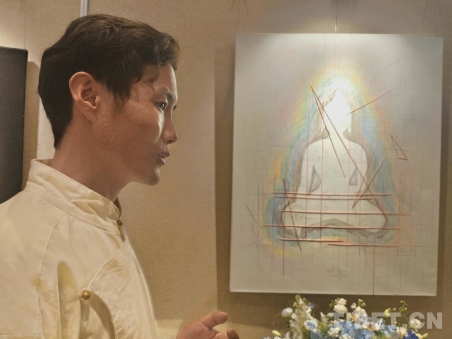 圖為5月2日至8日舉行的“三國同框 四季如畫 五彩亞東——亞東縣文化交流及特色產(chǎn)品展銷活動(dòng)”上,亞東青年藝術(shù)家索喃次仁在介紹他的作品 攝影:趙釗