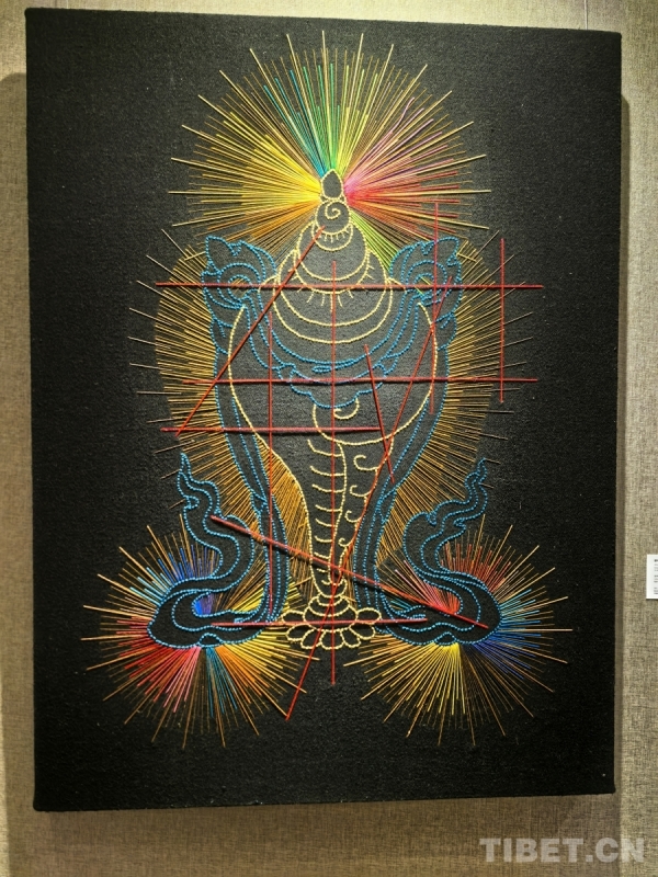 索喃次仁的作品慣以手工羊絨布為面,彩色羊毛線為語言,呈現(xiàn)標(biāo)志性的“彩虹”元素?!埃ㄎ鞑兀﹤鹘y(tǒng)的藝術(shù)是有一定標(biāo)準(zhǔn)的,而當(dāng)代藝術(shù)是可以無界的,包括材質(zhì)、材料都可以有所創(chuàng)新,是表達(dá)個(gè)人情感和生活的一種藝術(shù)形式。我常常問自己,能不能突破傳統(tǒng)?可不可以做一些比較新的東西?像我現(xiàn)在創(chuàng)作選擇用羊絨布,就是我的一種情感表達(dá),因?yàn)椋ㄋ┡c我的家鄉(xiāng)有深切關(guān)系?!彼鬣稳式忉尩?/span>:“比如說這一幅作品,佛像外呈現(xiàn)出一種彩虹的狀態(tài)。因?yàn)椴屎绫旧硎且粋€(gè)無常的現(xiàn)象,而我之前學(xué)過唐卡佛像,所以把佛像和彩虹理念結(jié)合了,這既是一種傳承,也是突破?!?/span>