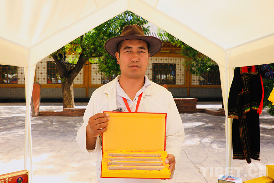 “我今天主要帶來的是我們的工藝產(chǎn)品‘供養(yǎng)藏香’,這些包裝樣式不一的藏香根據(jù)規(guī)格大小都有各自的價位,但每一根藏香上付出的心血及所使用的工藝和配料都一致,其中我們也更注重藏香的配料,都是精心篩選的白檀香、藏紅花、安息香、白黑沉香、甘松等二十多種源自高原的天然藥物和香味植物?!碑攩柕侥壳暗匿N售情況時,他坦言道:“今天賣出去的并不是很多,不過今天能和眾多的優(yōu)秀手工藝人同臺參展機會難得,對我來說也是一種學習和展現(xiàn)的契機?!?/p>