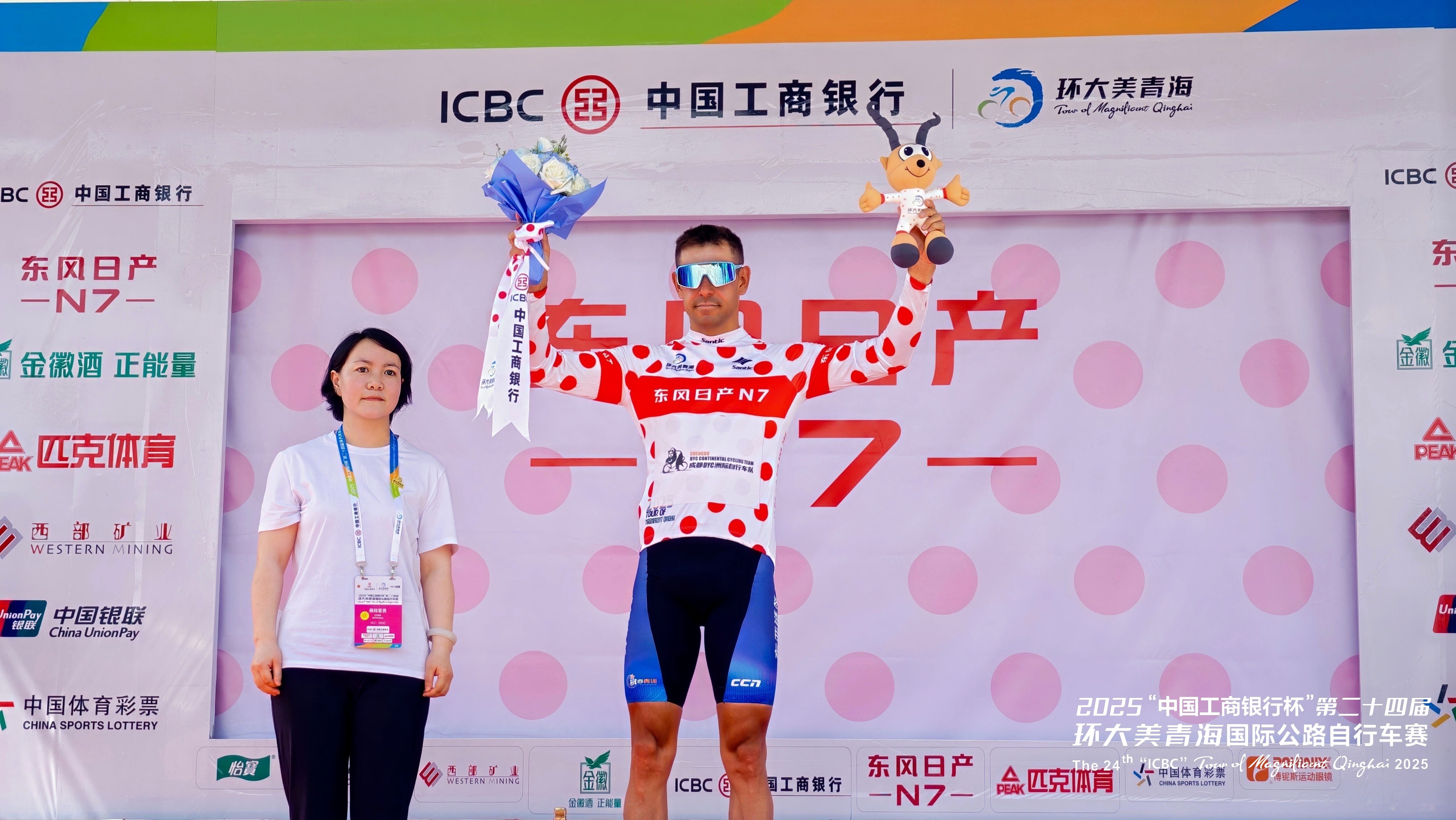 圖為本屆環(huán)青賽第一賽段結(jié)束后“圓點(diǎn)衫”獲得者,也被人們形象地稱為“爬坡王”。