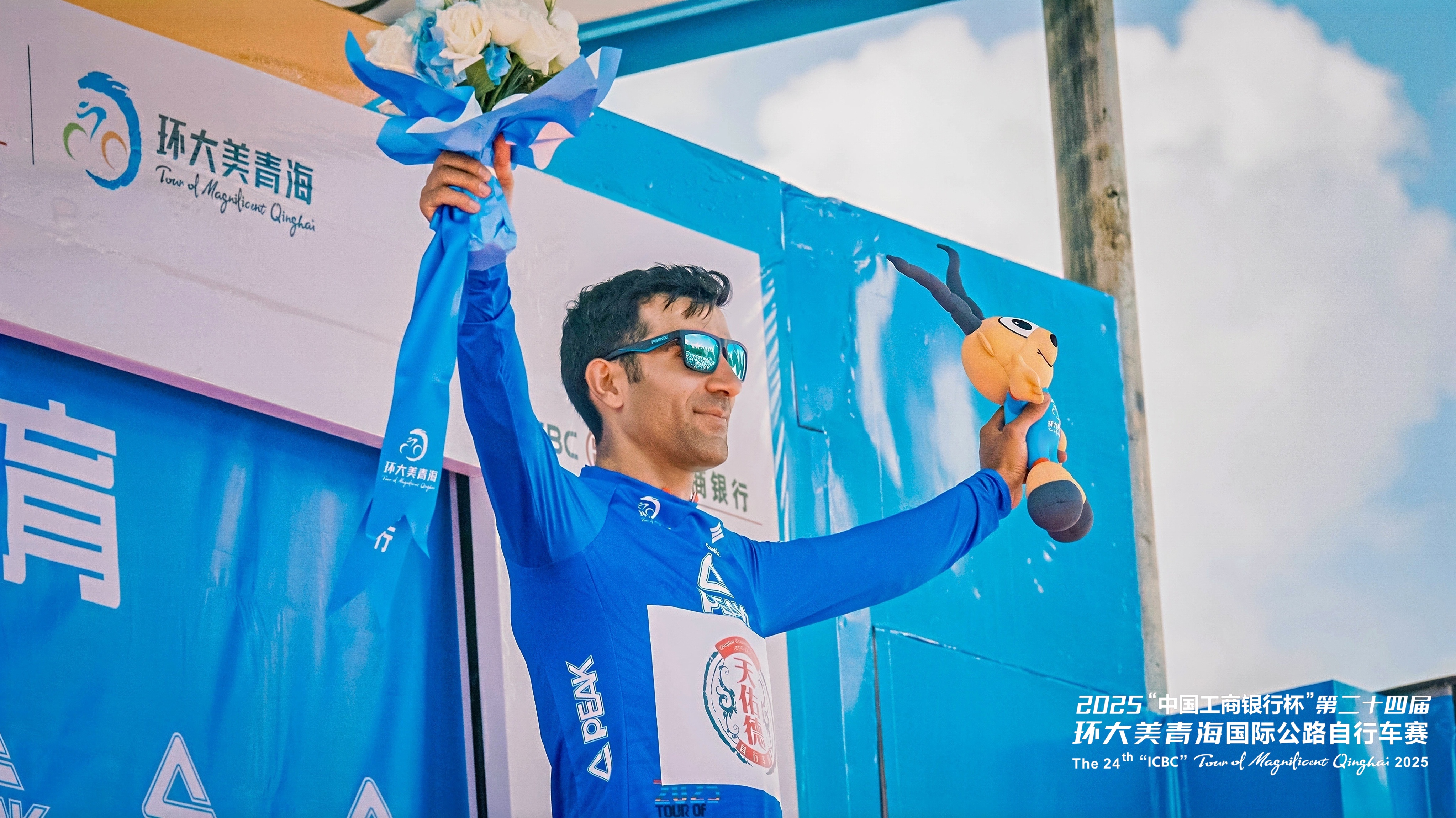圖為本屆環(huán)青賽第一賽段結(jié)束后“藍(lán)衫”獲得者,相當(dāng)于“亞洲車手中的黃衫”。