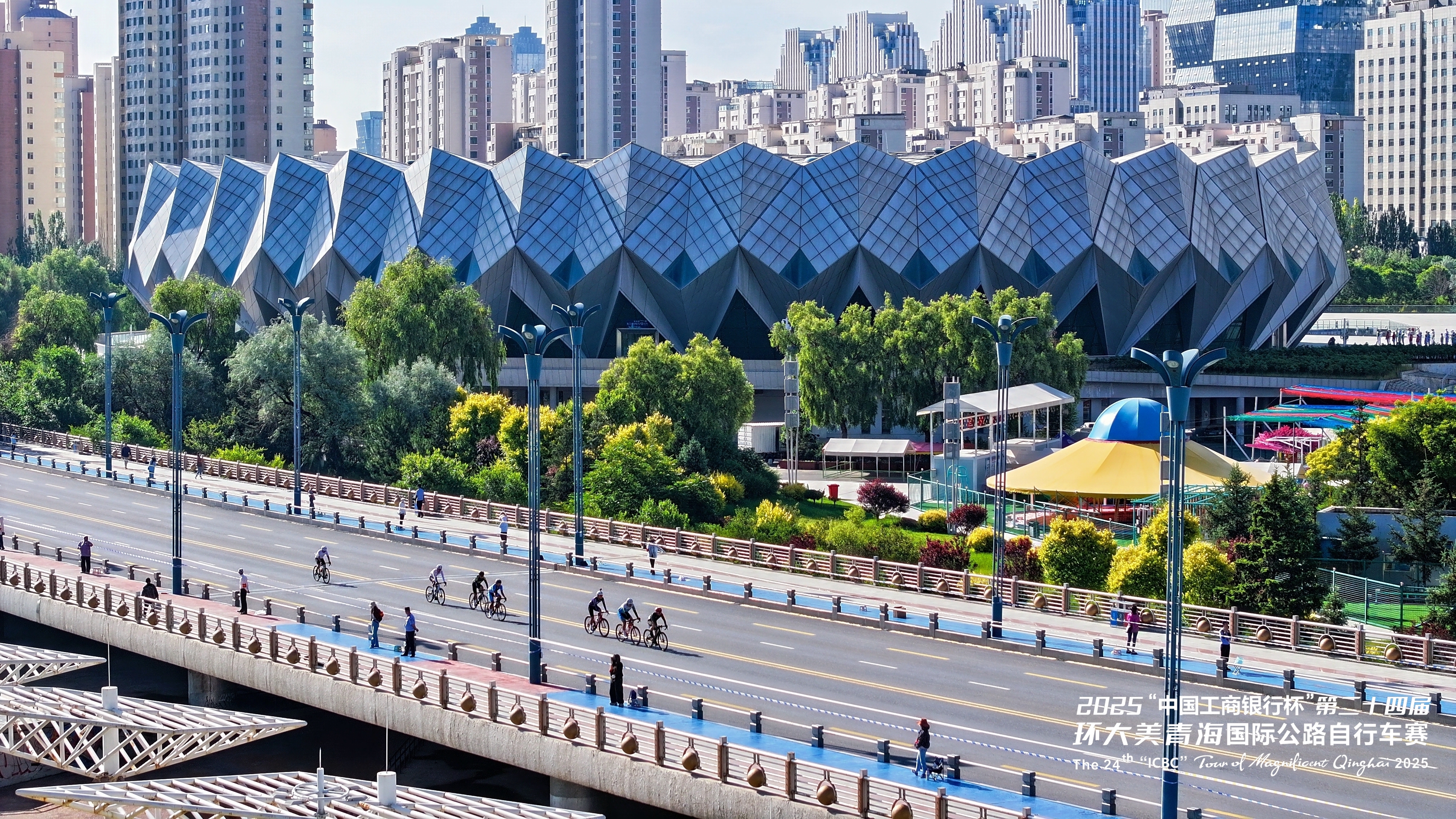 第二十四屆環(huán)青賽的第一賽段——西寧繞圈賽,選手們穿行于西寧市繁華的鋼鐵森林中,感受這座高原古城的現(xiàn)代活力。圖為選手們騎行至青海體育中心。