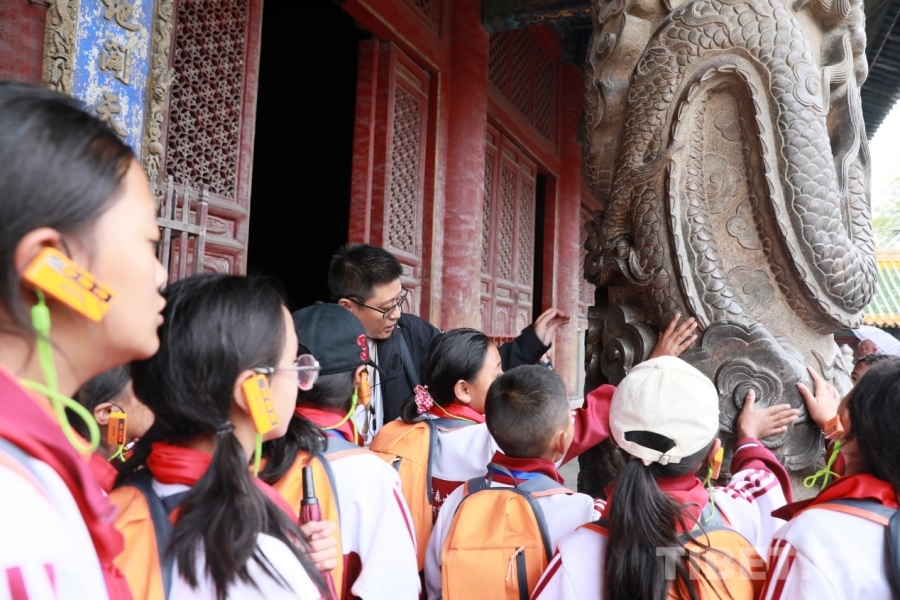 圖為西藏阿里噶爾縣孔繁森小學的孩子們在山東曲阜孔廟大成殿外用手感受殿外盤龍巨柱透雕工藝 攝影:劉莉