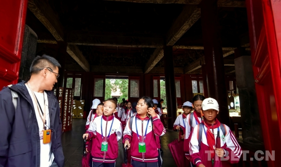 圖為西藏阿里噶爾縣孔繁森小學的孩子們在山東曲阜孔廟大成殿外聆聽講解并與講解員交流 攝影:劉莉