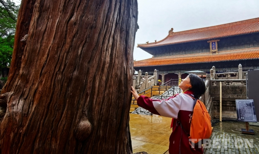圖為西藏阿里噶爾縣孔繁森小學學生在山東曲阜孔廟大成殿外用手感受殿外參天古柏 攝影:劉莉