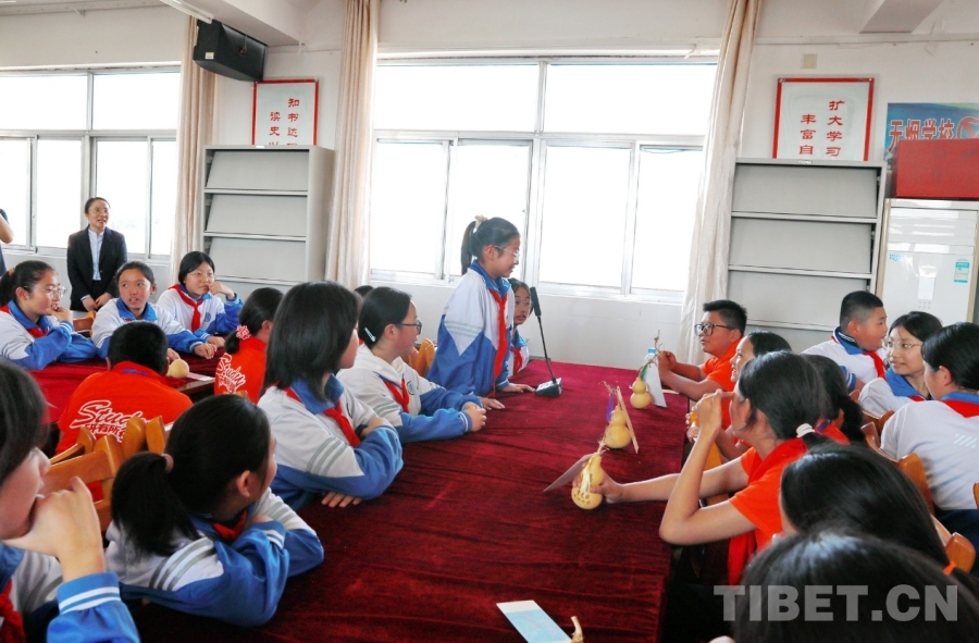 圖為山東聊城堂邑鎮(zhèn)中心小學(xué)學(xué)生向西藏阿里噶爾縣孔繁森小學(xué)的小伙伴贈(zèng)送并介紹媽媽親手制作的向日葵小擺件 攝影:劉莉