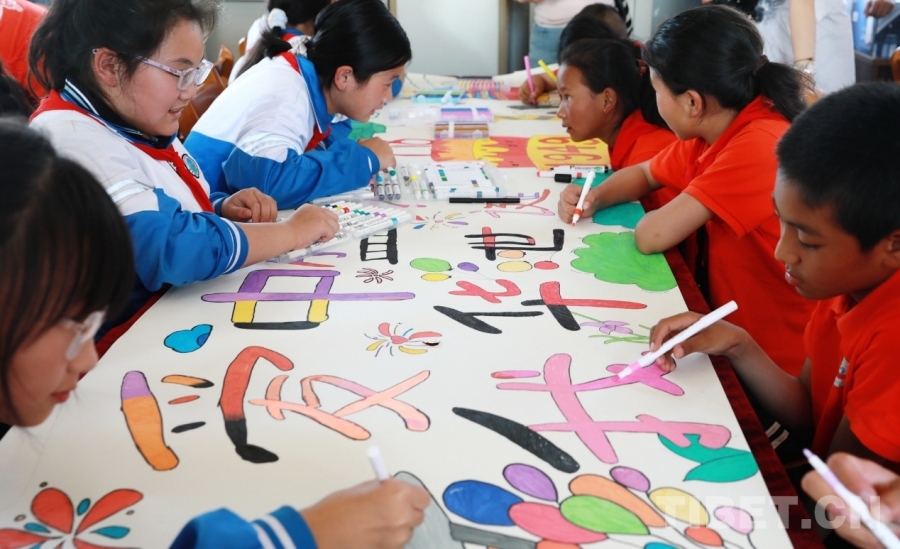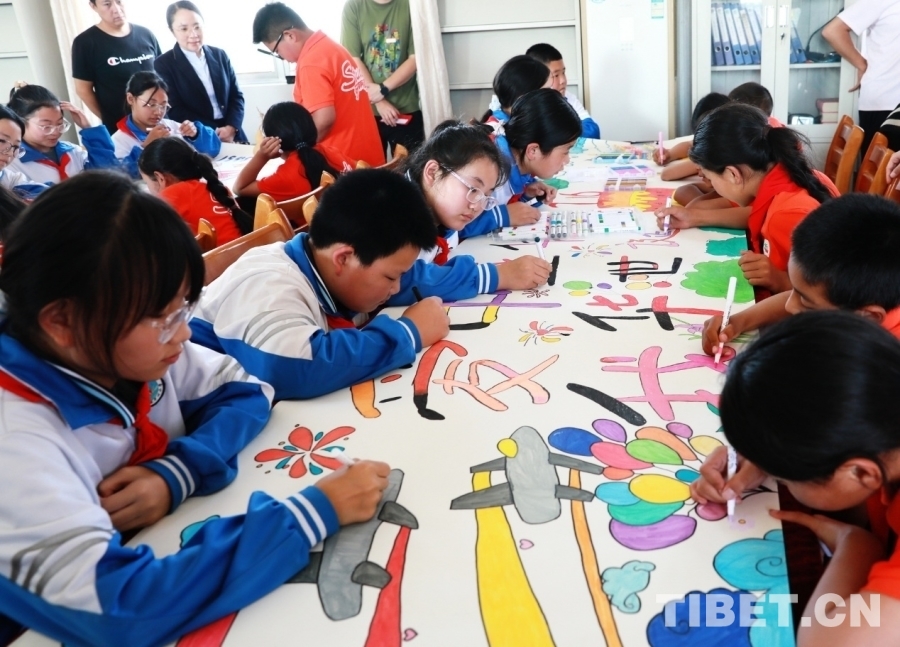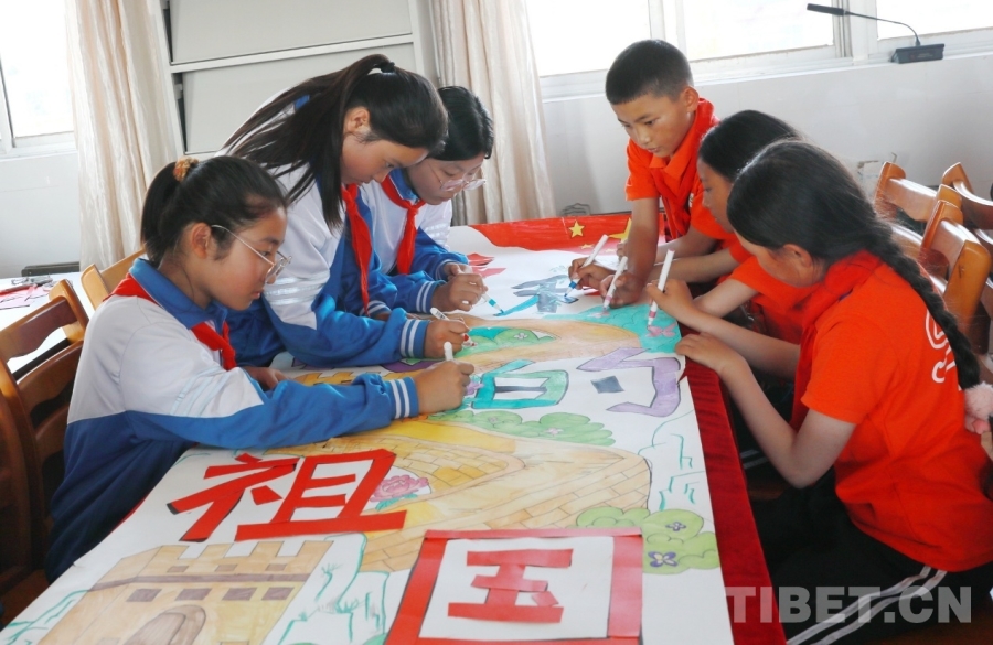 圖為西藏阿里噶爾縣孔繁森小學(xué)、山東聊城堂邑鎮(zhèn)中心小學(xué)的孩子們共同創(chuàng)作迎國(guó)慶主題畫卷 攝影:劉莉