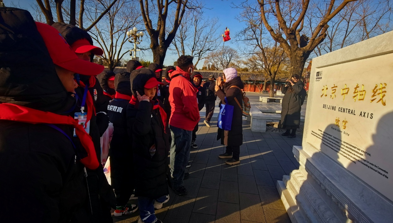 圖為西藏自治區(qū)那曲市色尼區(qū)青少年足球隊赴京研學(xué)團(tuán)一行在了解被列入《世界遺產(chǎn)名錄》的北京中軸線 攝影:劉莉