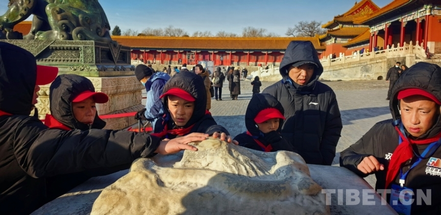 圖為西藏自治區(qū)那曲市色尼區(qū)青少年足球隊赴京研學(xué)團(tuán)的孩子們感受故宮古老的石刻 攝影:劉莉