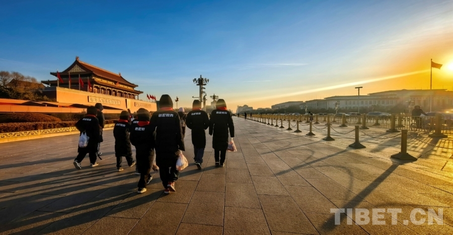 圖為西藏自治區(qū)那曲市色尼區(qū)青少年足球隊赴京研學(xué)團(tuán)一行迎著朝陽走在北京長安街上 攝影:劉莉