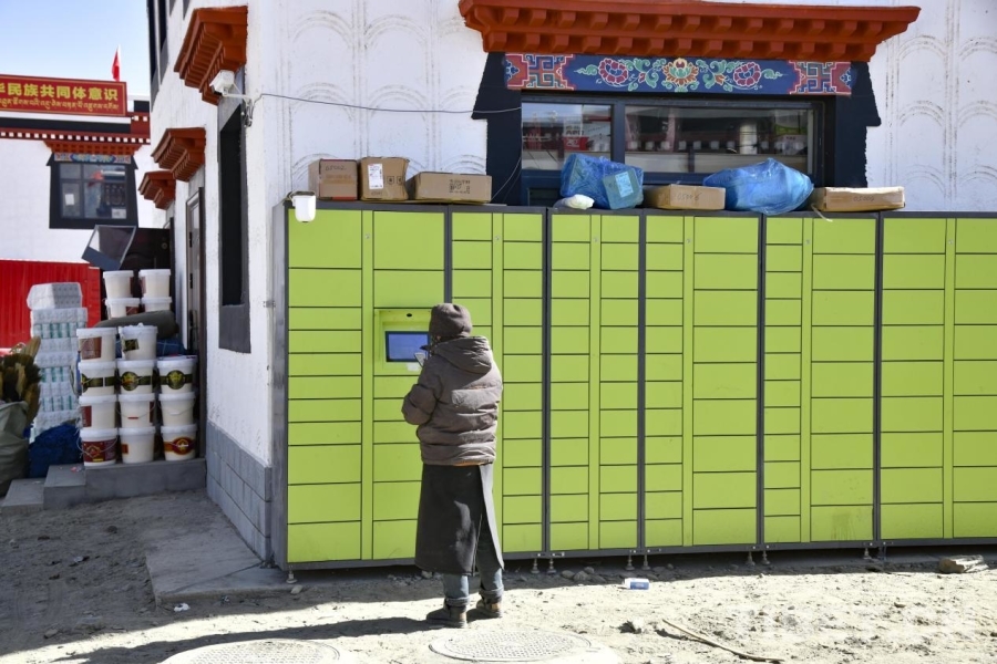 圖為定日縣長所鄉(xiāng)森嘎村村民在自動(dòng)快遞柜前收取快遞。攝影:趙振宇