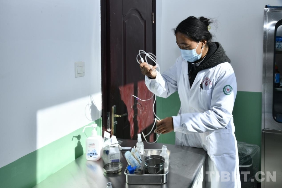圖為在定日縣長所鄉(xiāng)森嘎村新修建的村衛(wèi)生室內(nèi),護(hù)士正在做醫(yī)療準(zhǔn)備。攝影:趙振宇