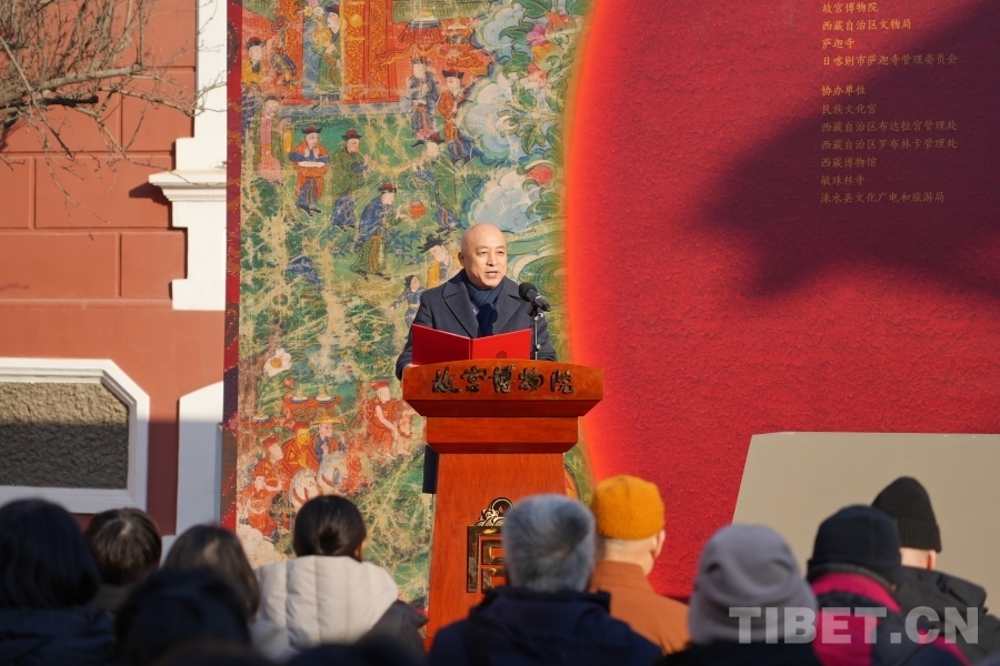 展覽開(kāi)幕式現(xiàn)場(chǎng),文化和旅游部黨組成員、故宮博物院院長(zhǎng)王旭東,西藏自治區(qū)人民政府黨組成員、副主席徐志濤,故宮博物院原院長(zhǎng)鄭欣淼,中國(guó)文物保護(hù)基金會(huì)理事長(zhǎng)劉玉珠,中國(guó)佛教協(xié)會(huì)會(huì)長(zhǎng)演覺(jué),中國(guó)古跡遺址保護(hù)協(xié)會(huì)理事長(zhǎng)宋新潮,國(guó)家民族事務(wù)委員會(huì)古籍整理研究室一級(jí)巡視員孫繼為,故宮博物院黨委書(shū)記、副院長(zhǎng)都海江,文化和旅游部非物質(zhì)文化遺產(chǎn)司二級(jí)巡視員張玲,西藏自治區(qū)人民政府辦公廳二級(jí)巡視員旦巴央培,西藏自治區(qū)文化廳黨組成員、西藏自治區(qū)文物局黨組書(shū)記、副局長(zhǎng)趙興邦,全國(guó)政協(xié)委員、薩迦寺寺管會(huì)常務(wù)副主任洛卓加措,香港賽馬會(huì)慈善事務(wù)部主管葉巧兒出席。文化和旅游部、國(guó)家文物局下屬文博單位,西藏自治區(qū)人民政府下屬相關(guān)單位,北京市人民政府下屬相關(guān)單位,本次展覽的獨(dú)家捐助方公益慈善研究院,相關(guān)協(xié)會(huì)、學(xué)會(huì)、基金會(huì),各參展單位,特邀相關(guān)業(yè)務(wù)合作單位等也現(xiàn)場(chǎng)出席。