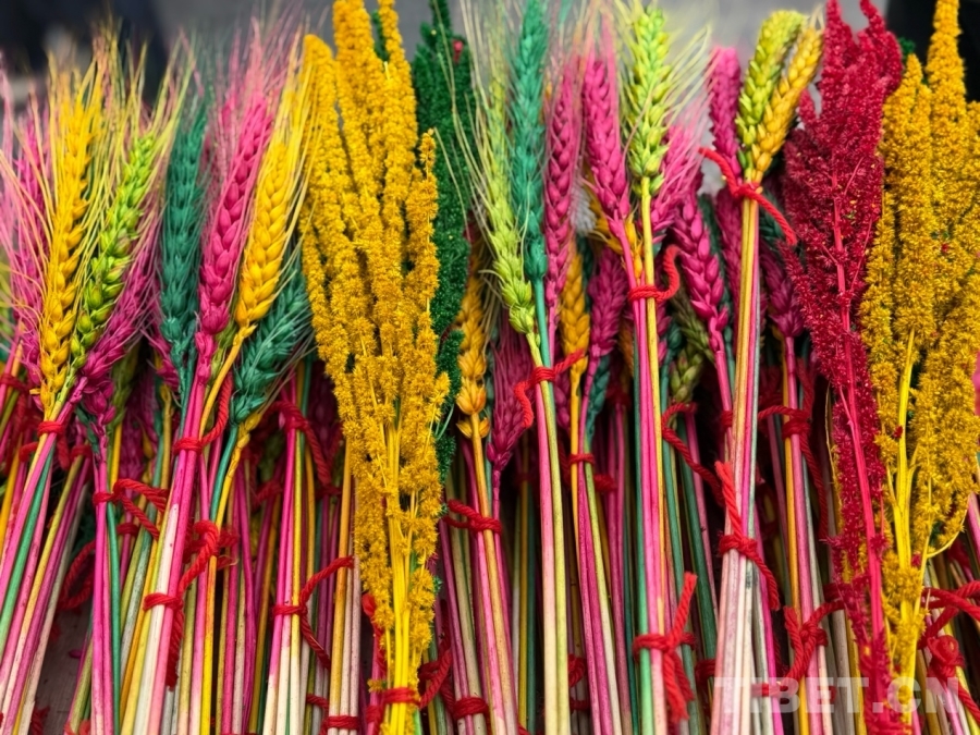 圖為藏年花,藏語稱為“羅薩梅朵”,是用麥穗染成藍(lán)、黃、綠、紅等顏色,寓意豐收美滿。