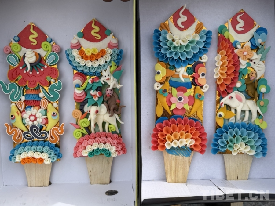 圖為酥油花,藏語稱為“孜卓”,藏歷新年供奉在切瑪盒內(nèi)。制作時(shí),手工藝人們先是在酥油中加入各色礦物顏料,制成胚料,再手工捏制成佛像、人物、花卉樹木、飛禽走獸等。