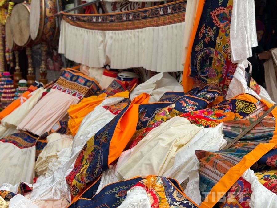 圖為香布,是懸掛于藏式建筑的門窗上部,通常用五彩綢布縫制而成,主體顏色為白色,再配上紅、藍(lán)、黃等顏色的邊沿?!跋悴肌币荒暌粨Q,祈求新意和吉祥,也標(biāo)志著新年的到來。