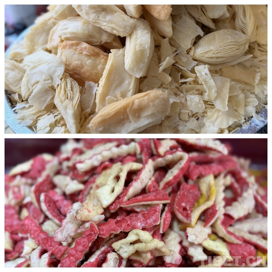 圖為卡塞,是一種油炸面食,是藏歷新年必備的年貨之一??ㄈ话阌妹娣邸⑺钟?、白糖等原料,油炸而成。橢圓形的“果子”、蝴蝶狀的“耳朵”……各色造型的“卡塞”寄托著人們對(duì)團(tuán)圓、富足的美好祈愿。