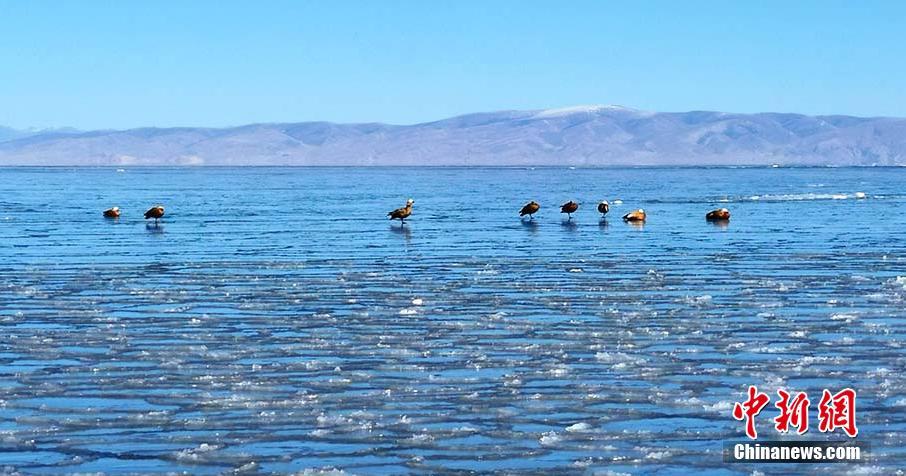 圖為野生鳥(niǎo)類在冰面上嬉戲。趙海梅 攝