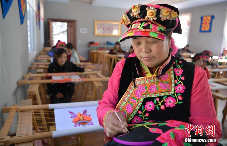 圖為1月13日,四川瀘定縣烹壩鎮(zhèn)繡娘巧手繡花。中新社記者 劉忠俊 攝