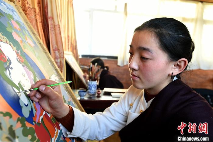 圖為1月13日,在阿壩縣“特果”唐卡藝術傳習基地二樓的畫室里,“00后”唐卡畫師更姐正在繪制唐卡。中新社記者 安源 攝