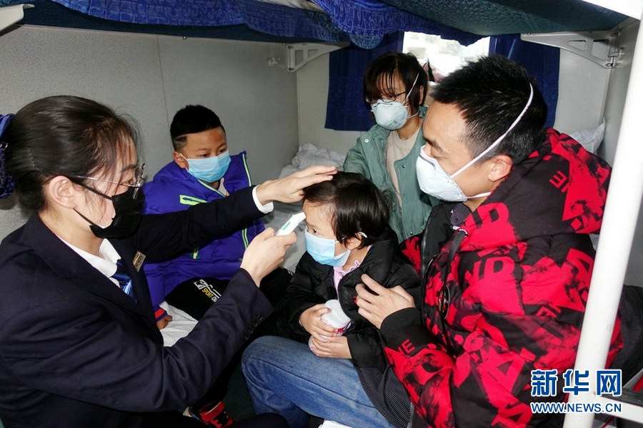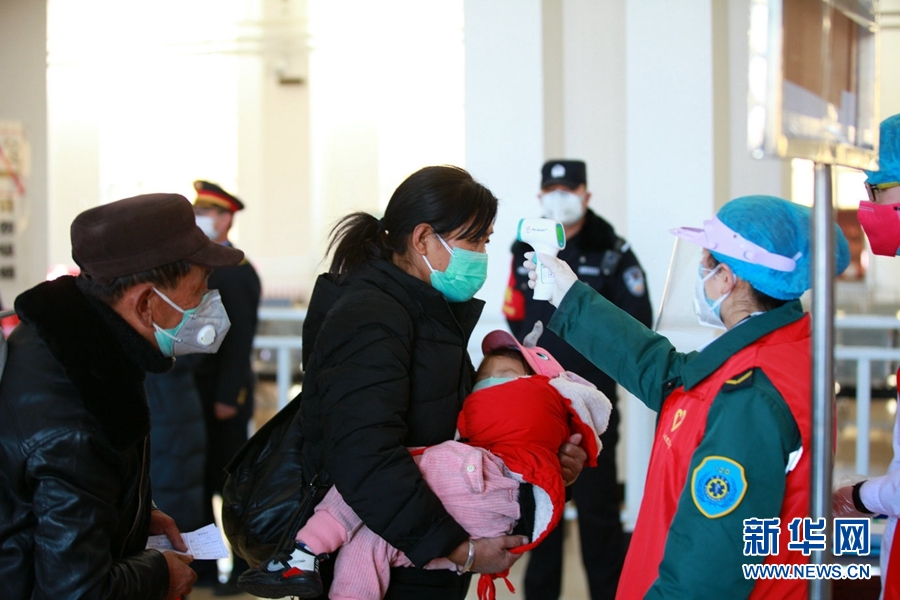 西寧客運(yùn)段職工為旅客測量體溫。新華網(wǎng) 郝寶君 攝