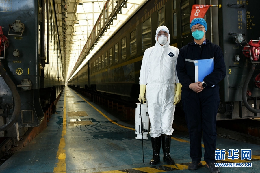 在西寧車輛段車庫內(nèi),鐵路防疫人員對(duì)每一輛旅客列車進(jìn)行全面消殺作業(yè)。新華網(wǎng) 李俊 攝